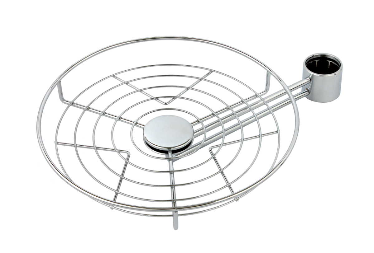 Боковая полка для барной системы присоединяется к вертикальной трубе с помощью выведенного в сторону крепления. Эта сетчатая полка может крутиться вокруг оси трубы, что особенно удобно во время застолий: полка становится дополнительным пространством