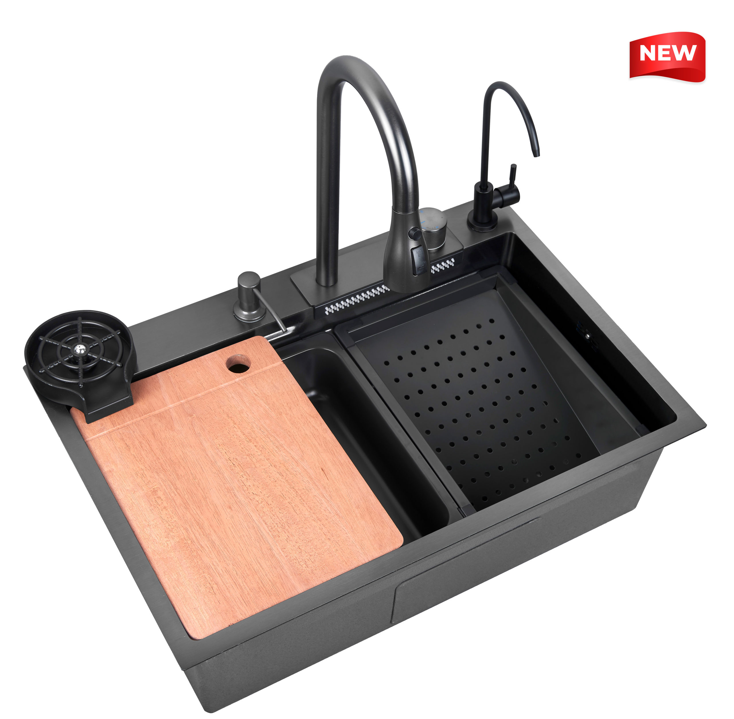Мойка (нержавеющая сталь 304), смеситель из нержавеющей стали, встроенный водопадный душ, кран для чистой воды из нержавеющей стали, регулятор слива, дозатор, ринзер ( омыватель стаканов) , коландер 2 шт. ( доп. чаша), доска из бамбука, сливная арматура.